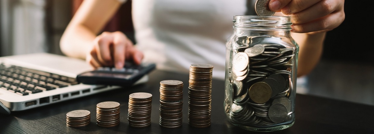 Vrouw achter laptop maakt berekening met een rekenmachine en heeft stapeltjes muntgeld neer gezet en een pot met muntgeld voor haar staan waar ze muntgeld in doet